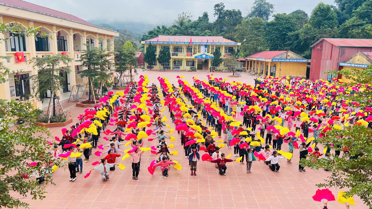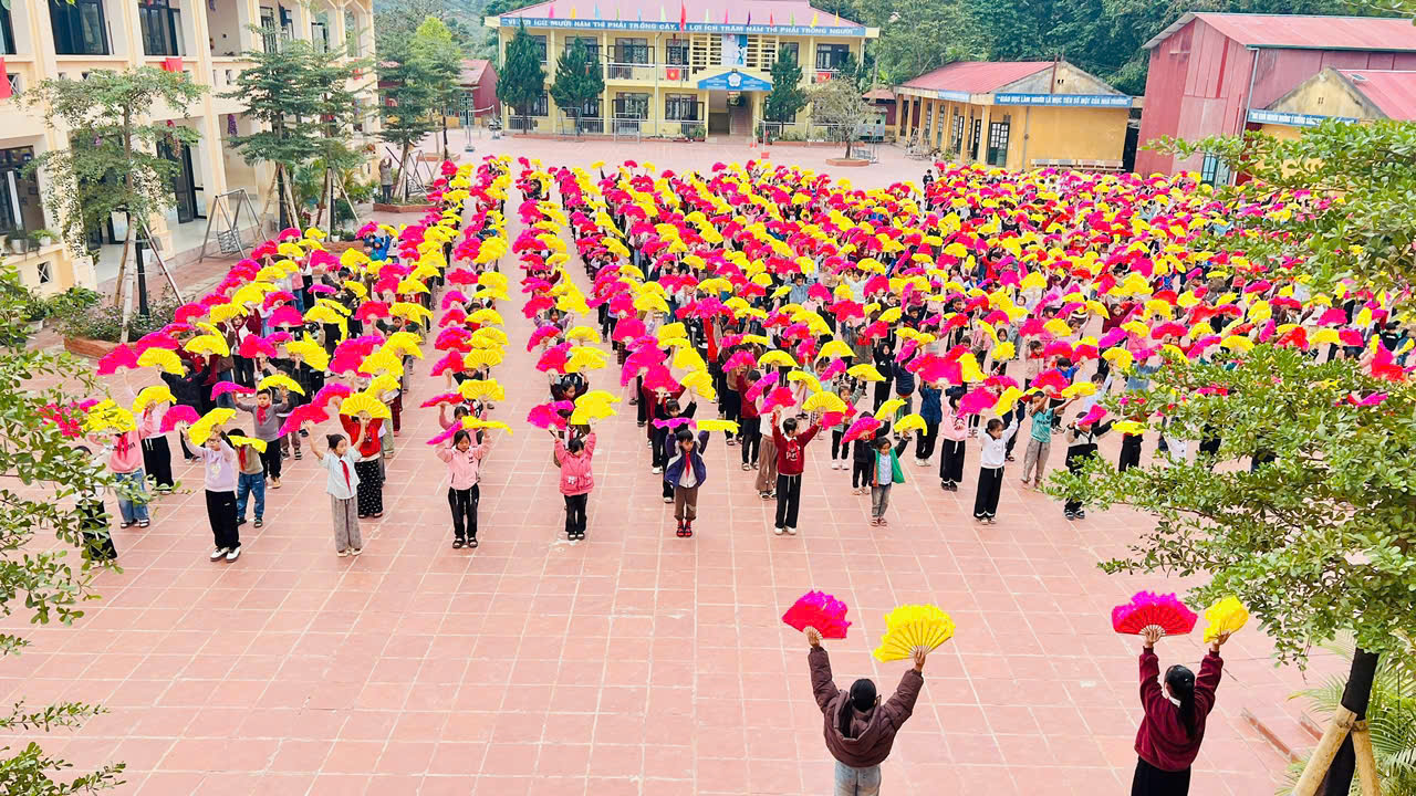 Những chiếc quạt rực rỡ hòa cùng giai điệu vui tươi và các động tác nhịp nhàng, đồng đều đã tạo nên không gian sinh hoạt tập thể mang đậm sắc xuân vùng cao, thể hiện tinh thần đoàn kết – kỷ luật – tự tin của các em học sinh.